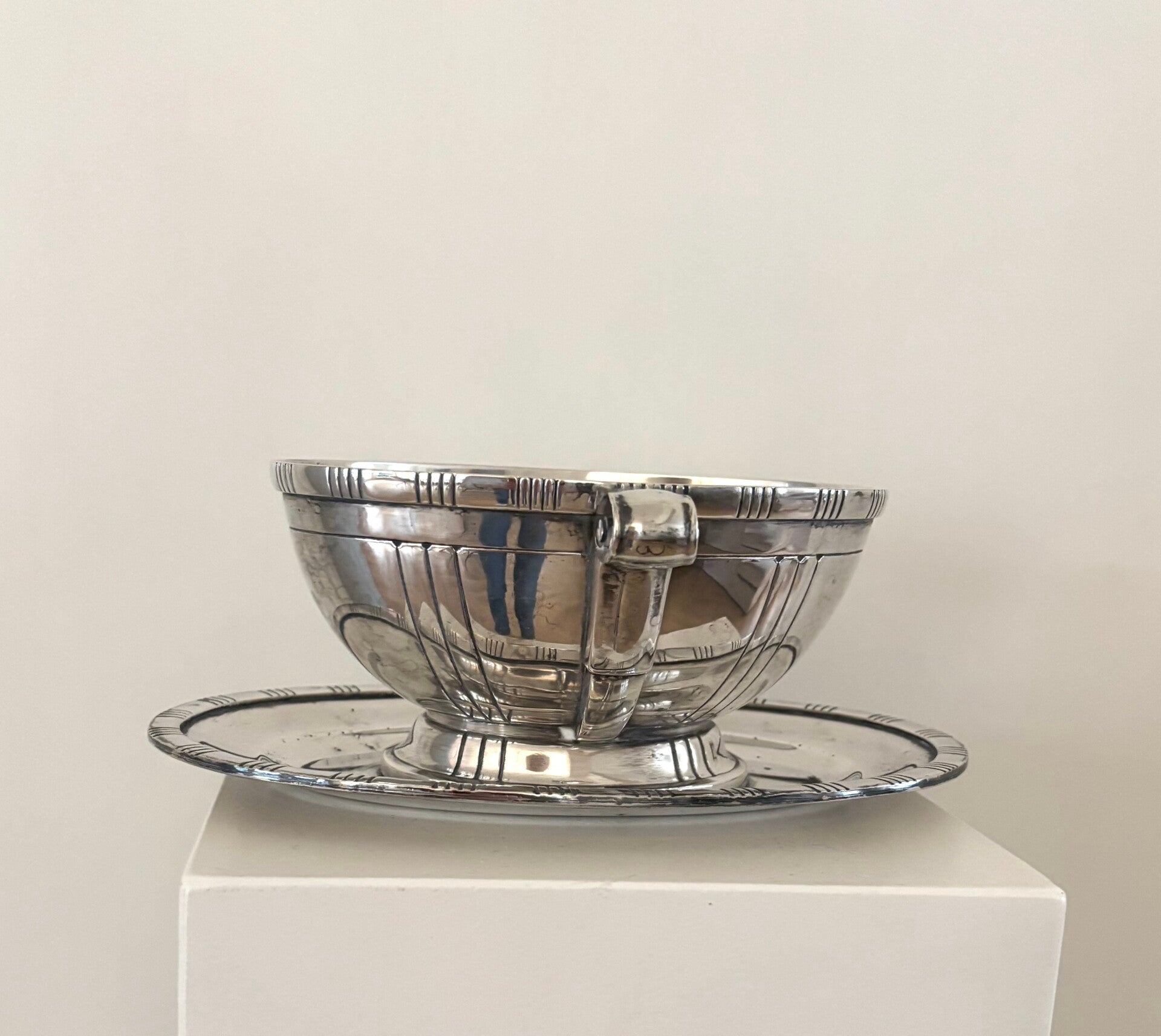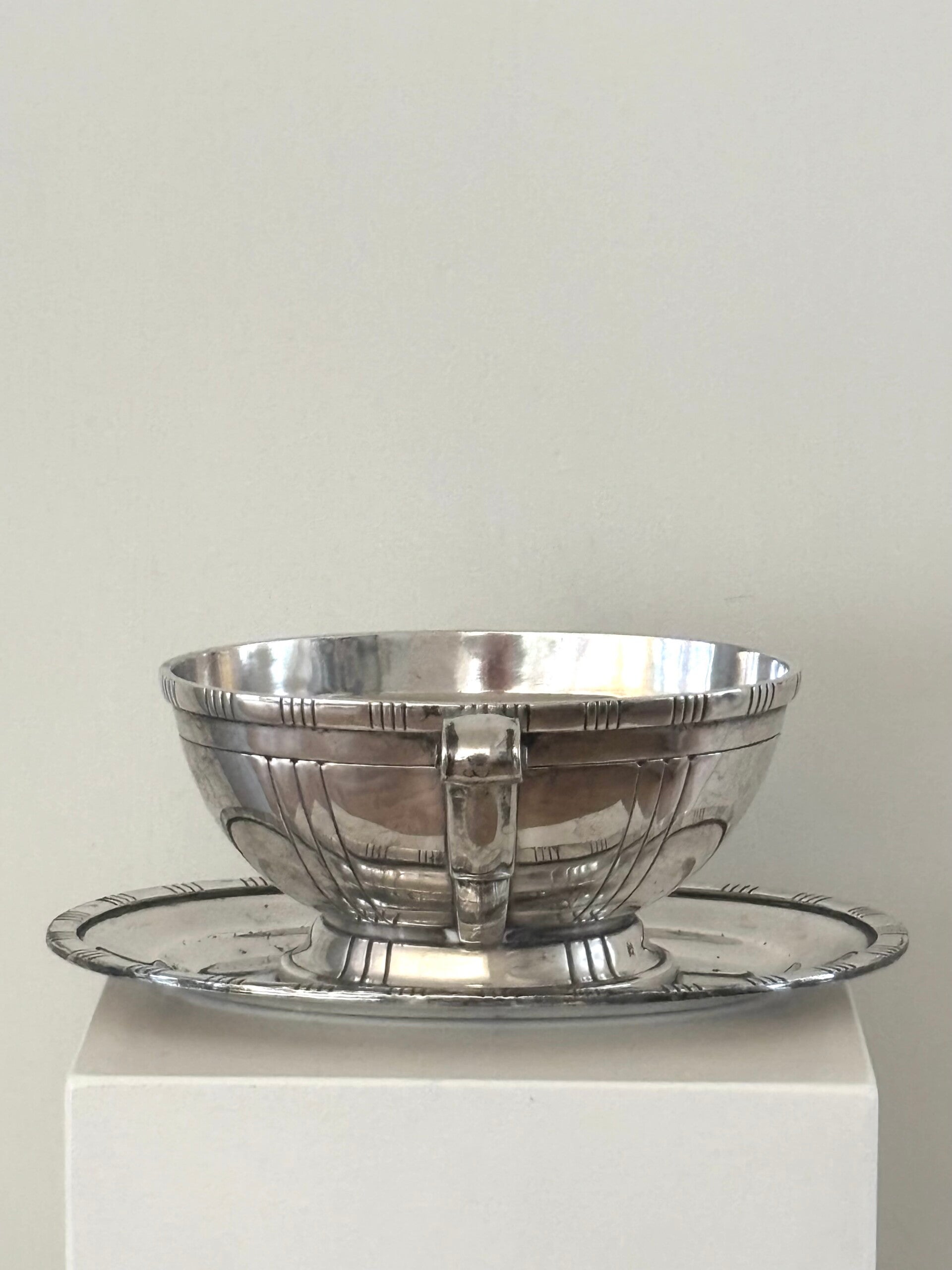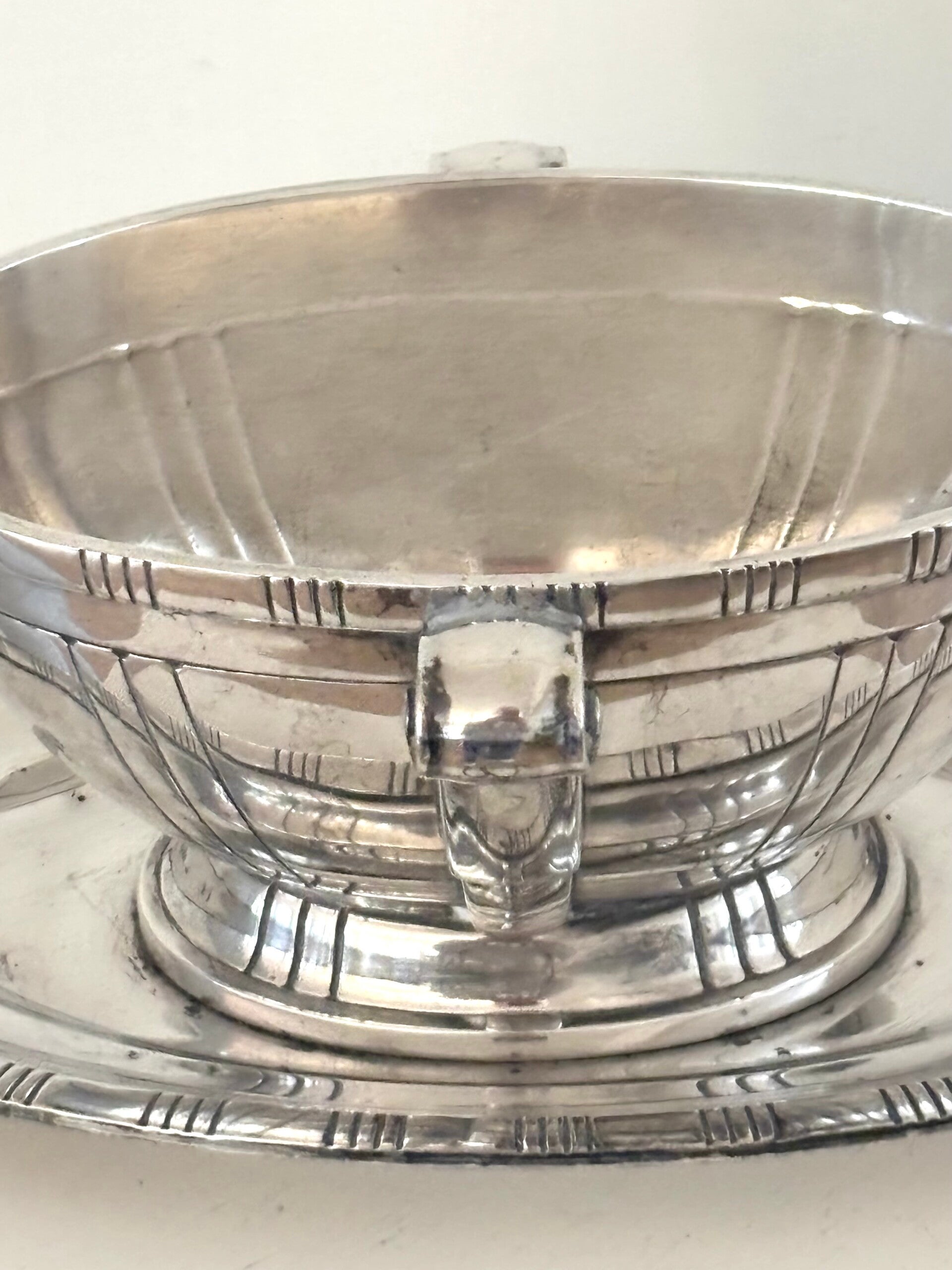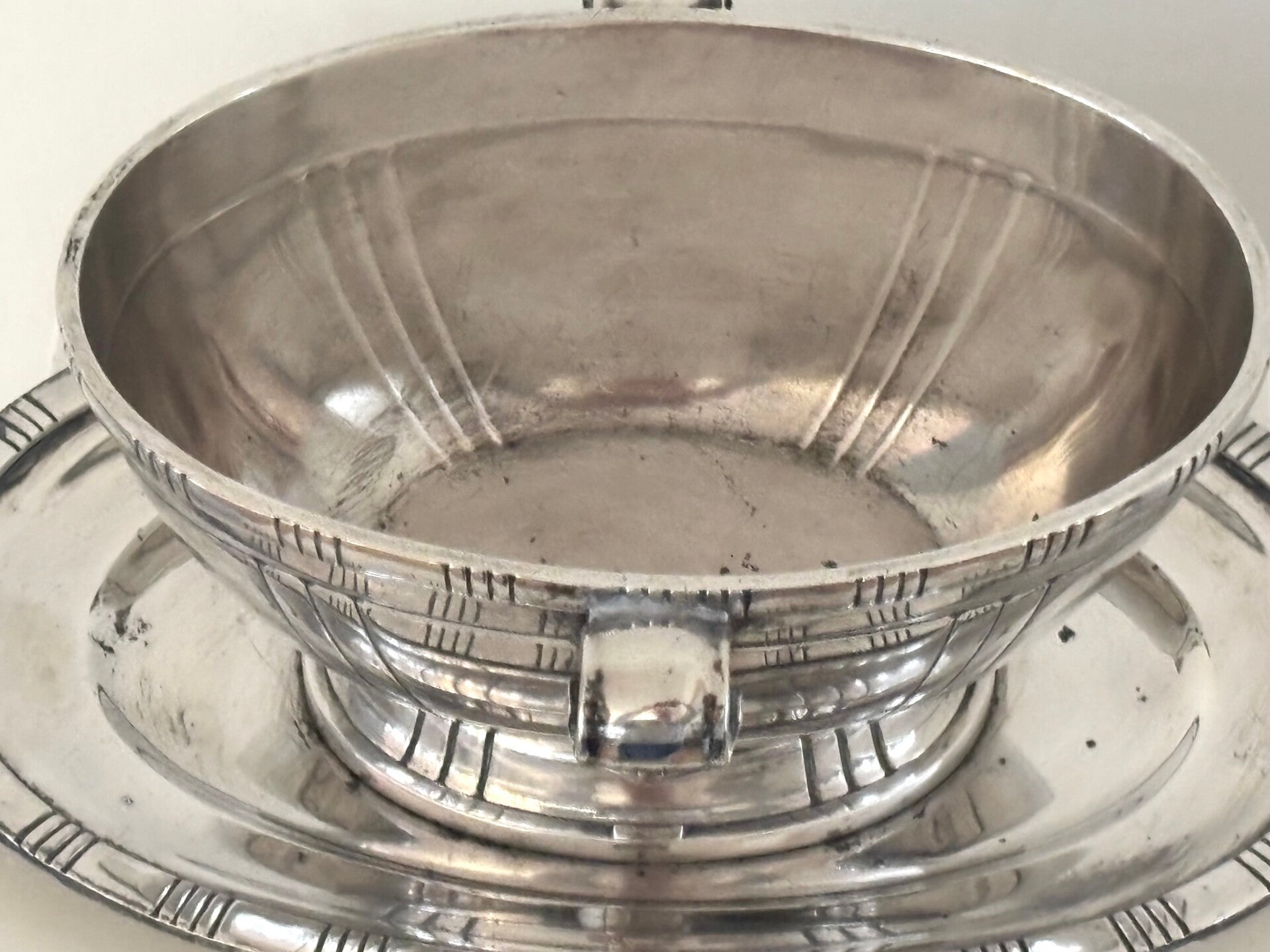 Zwaar verzilverde (20 gr) Franse antieke sauskom met prachtige details. Gemerkt met drie zilvermerken aan de onderzijde.