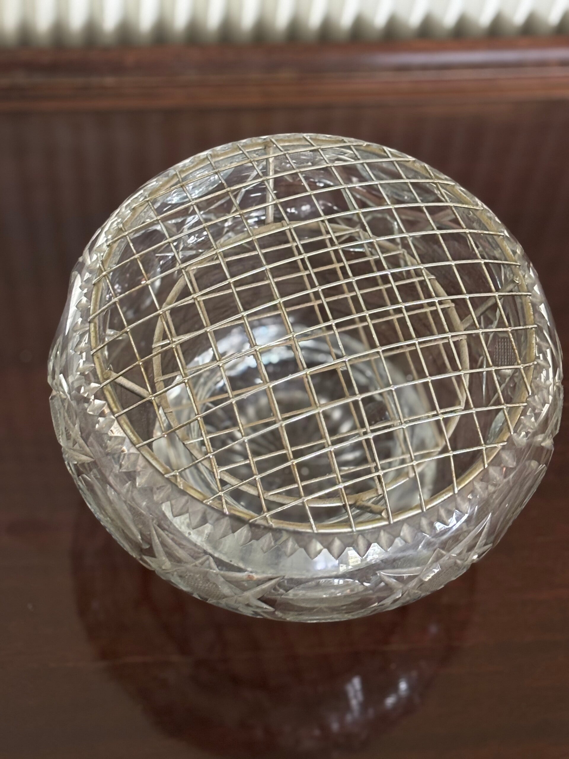 Antique crystal rose bowl with removable metal frog. Featuring an elegant cut pattern, both stylish and functional. Dimensions: 18 x 21 cm.
