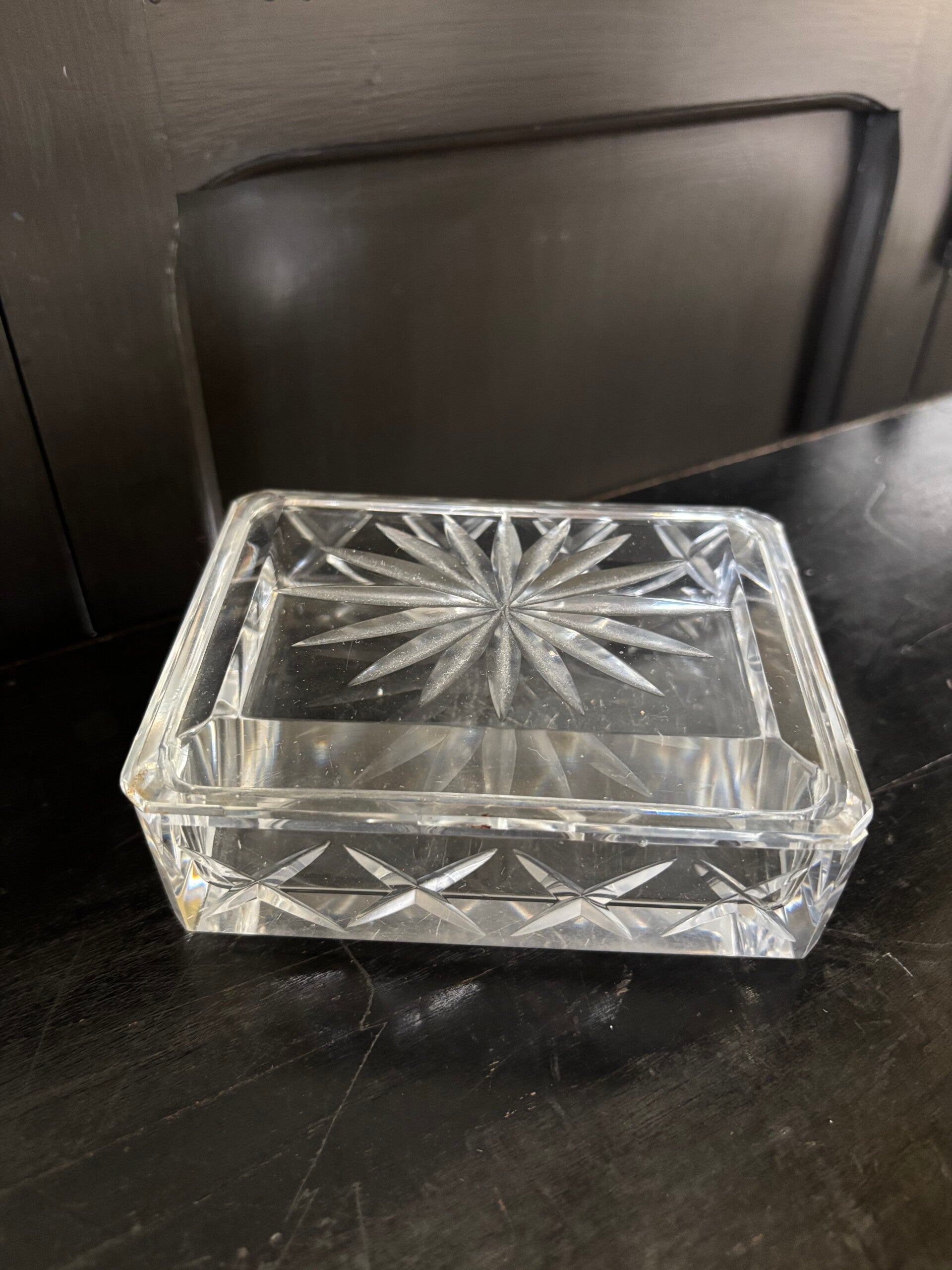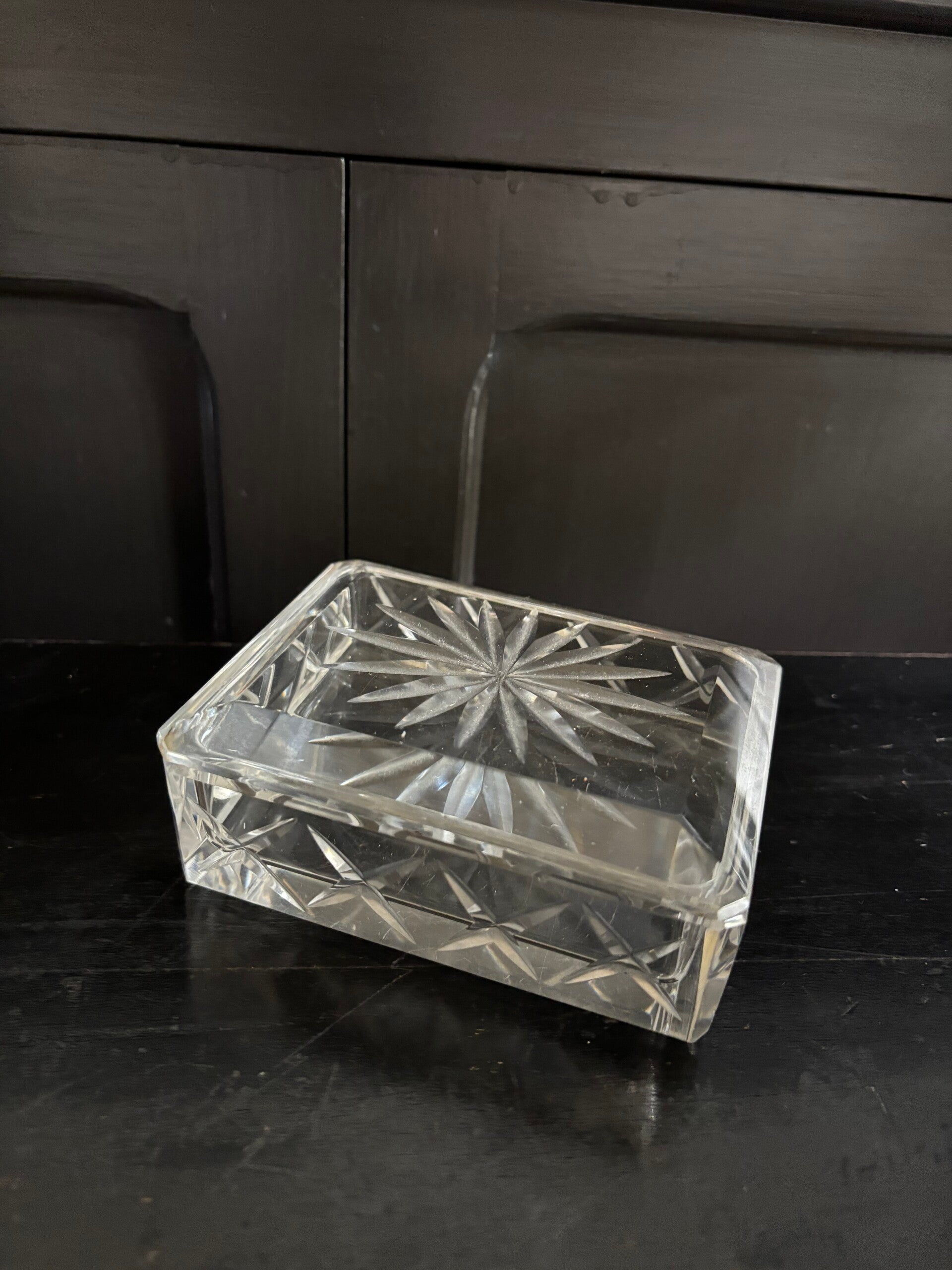 Kristallen doosje met verfijnd geslepen decor. Stijlvol en veelzijdig, ideaal voor sieraden of kleine objecten. Afmetingen: 12 x 9 cm.