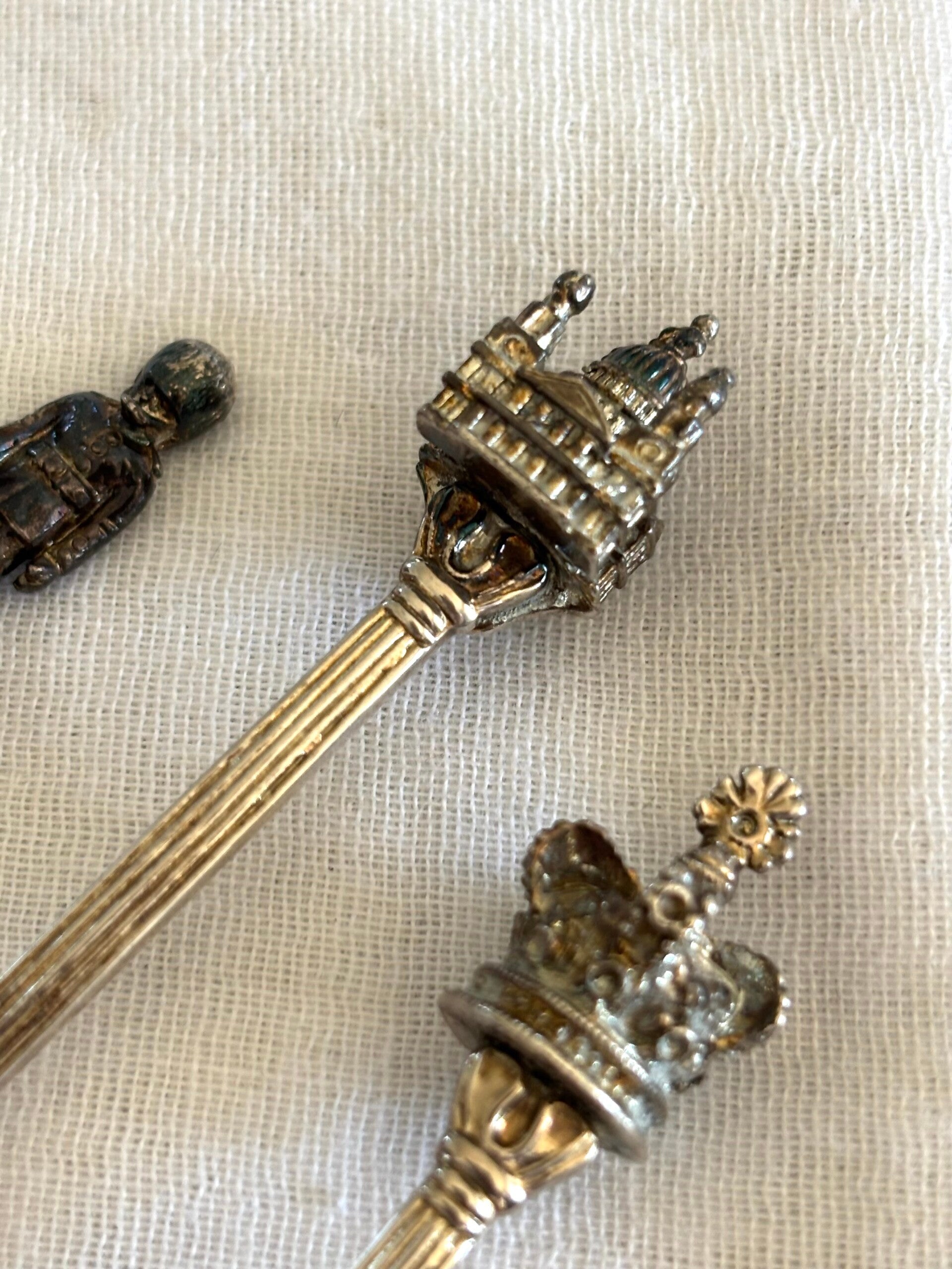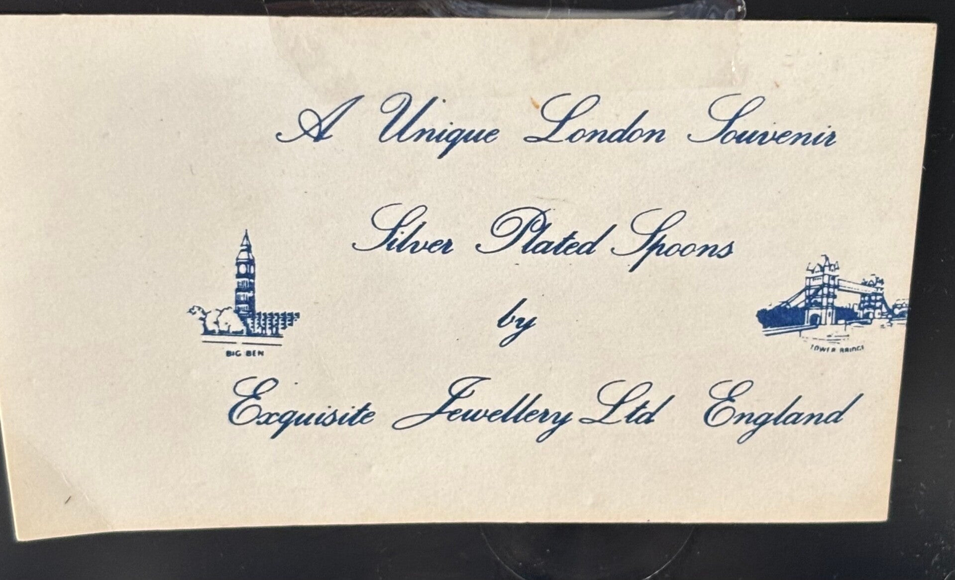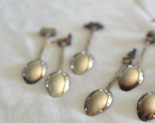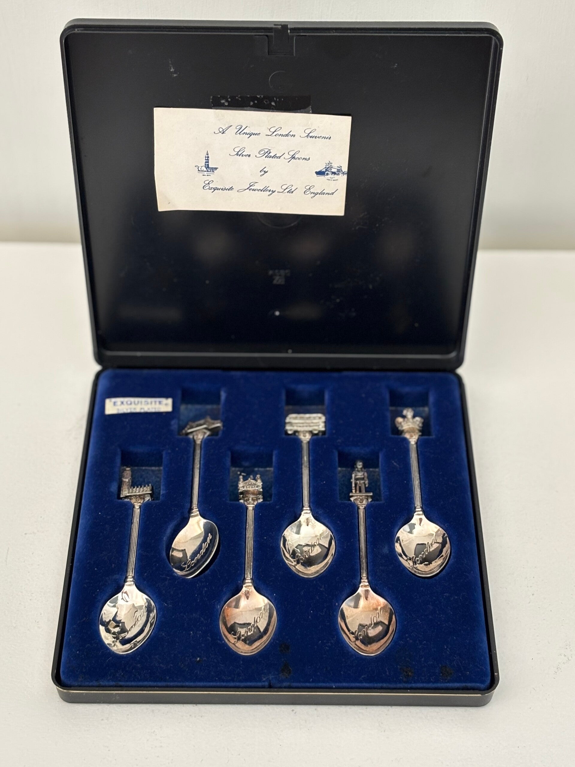 Set van 5 verzilverde lepeltjes, souvenir uit Londen met iconen zoals onder andere Big Ben en Tower Bridge. In mooie vintage staat. Lengte lepeltjes: ca. 10 cm.
