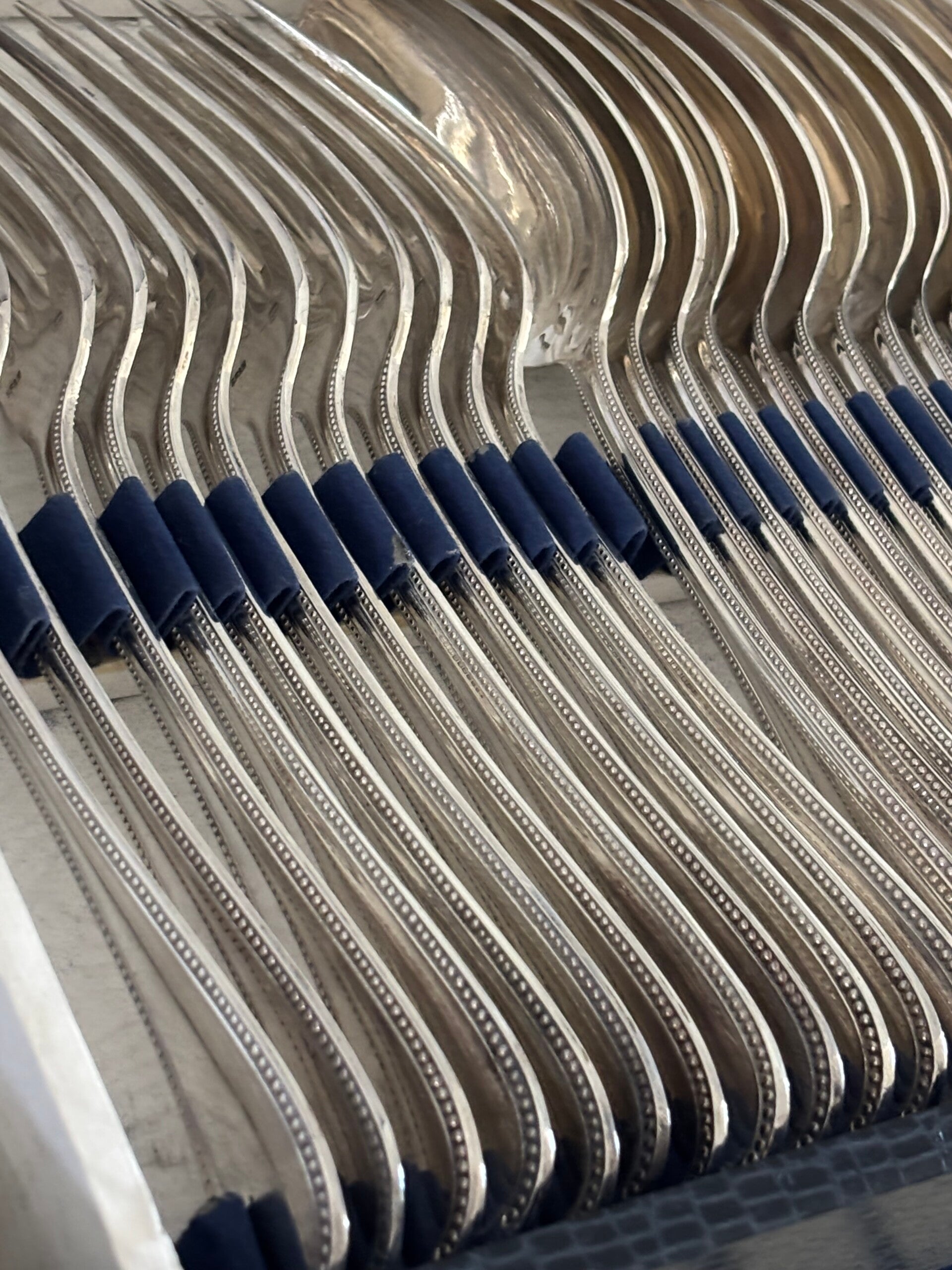 49-piece silver-plated cutlery set by Orfèvrerie Chambly, France. This 12-person flatware service features a timeless beaded edge and comes in the original case. Elegant and classic for a refined table setting.