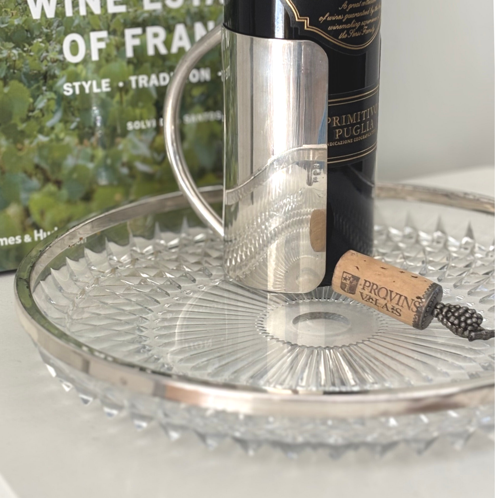 Verzilverde wijnfleshouder met elegant ontwerp. Gemerkt aan de zijkant. Stijlvol en praktisch voor tafel of bar.