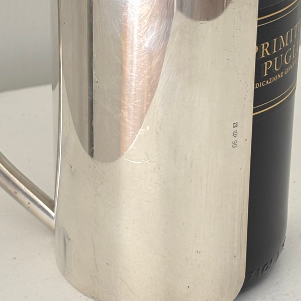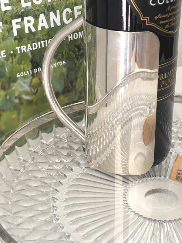Silver-plated wine bottle holder with elegant design. Marked on the side. Stylish and practical for table or bar.