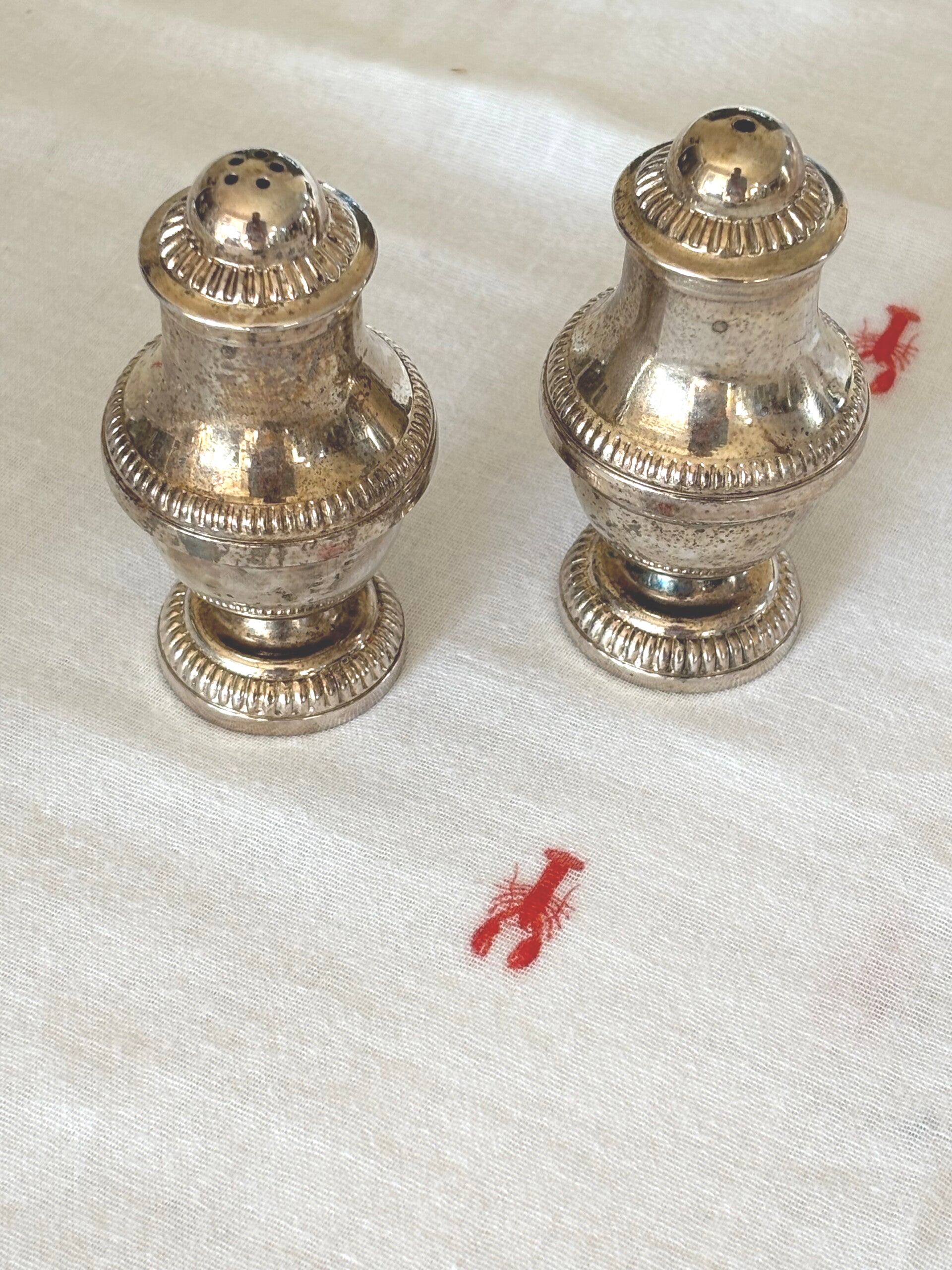 Verzilverd vintage peper- en zoutstel in klassiek model. Een verfijnde aanvulling voor de gedekte tafel. Afmetingen: 8,5 x 4 cm.
