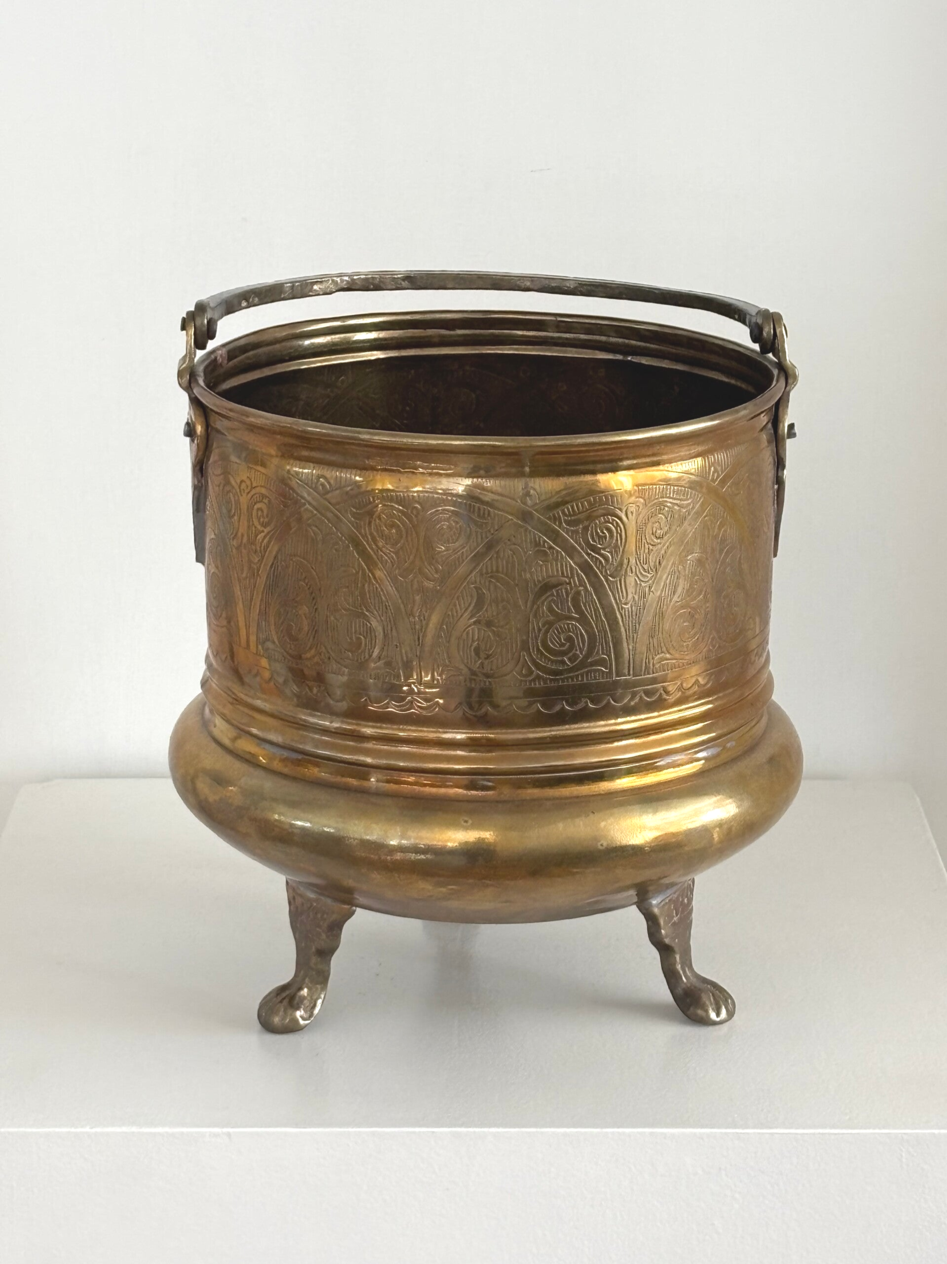 Koperen jardinière op pootjes. Decoratief met of zonder plant. Afmetingen: 25 x 21 cm.