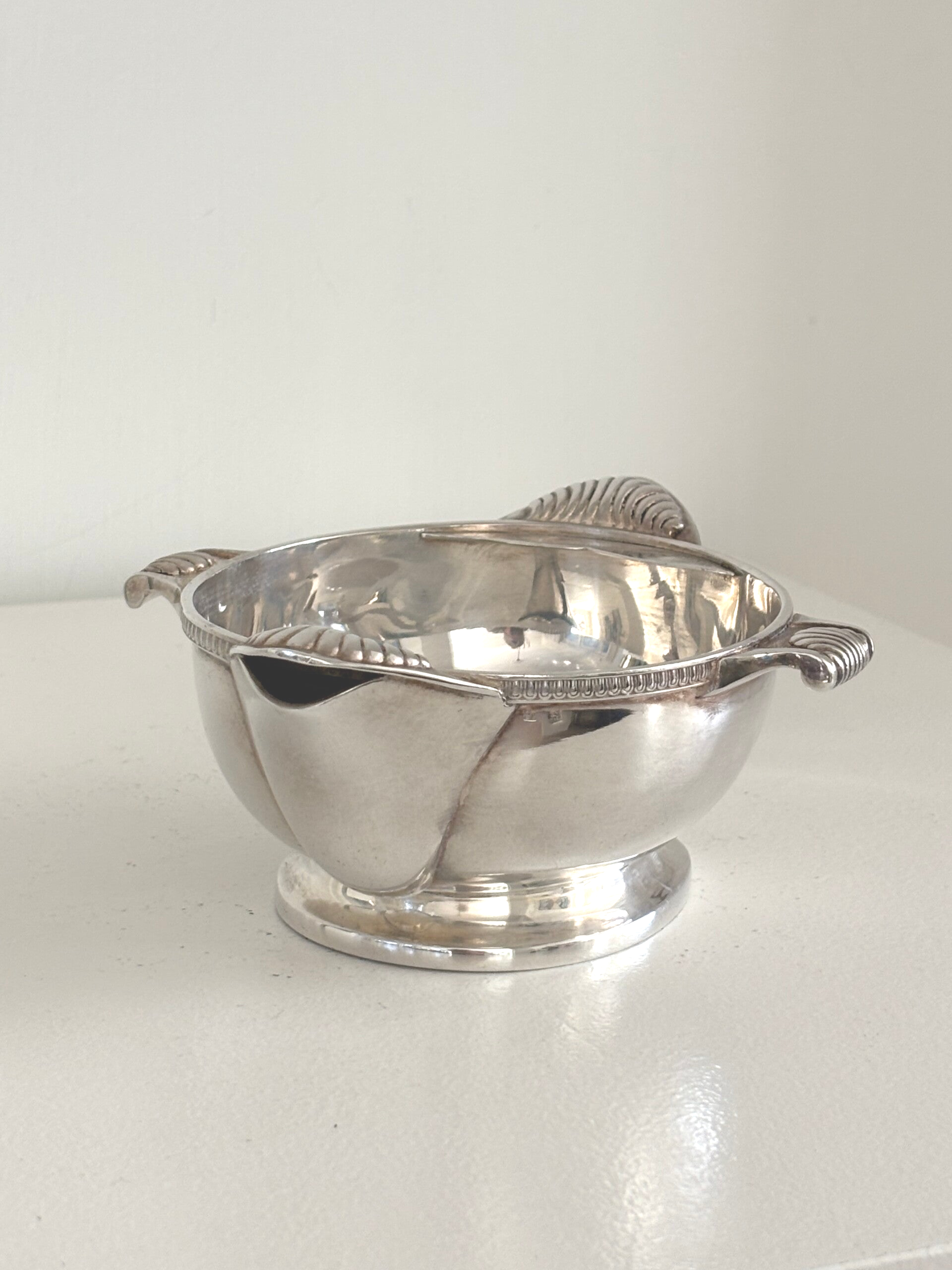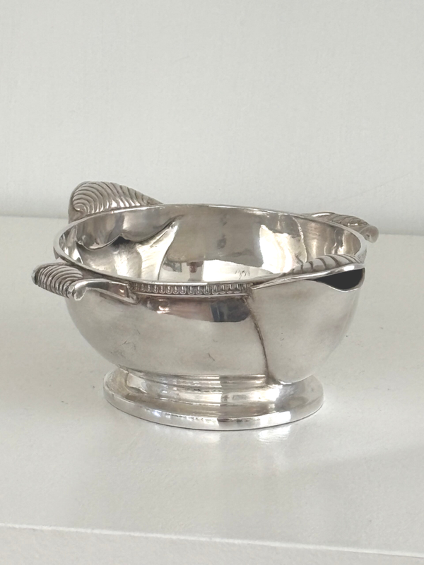 Silver-plated sauce boat with beautiful details. Featuring two pouring spouts, one small and one large. Dimensions: 16 x 14 cm.