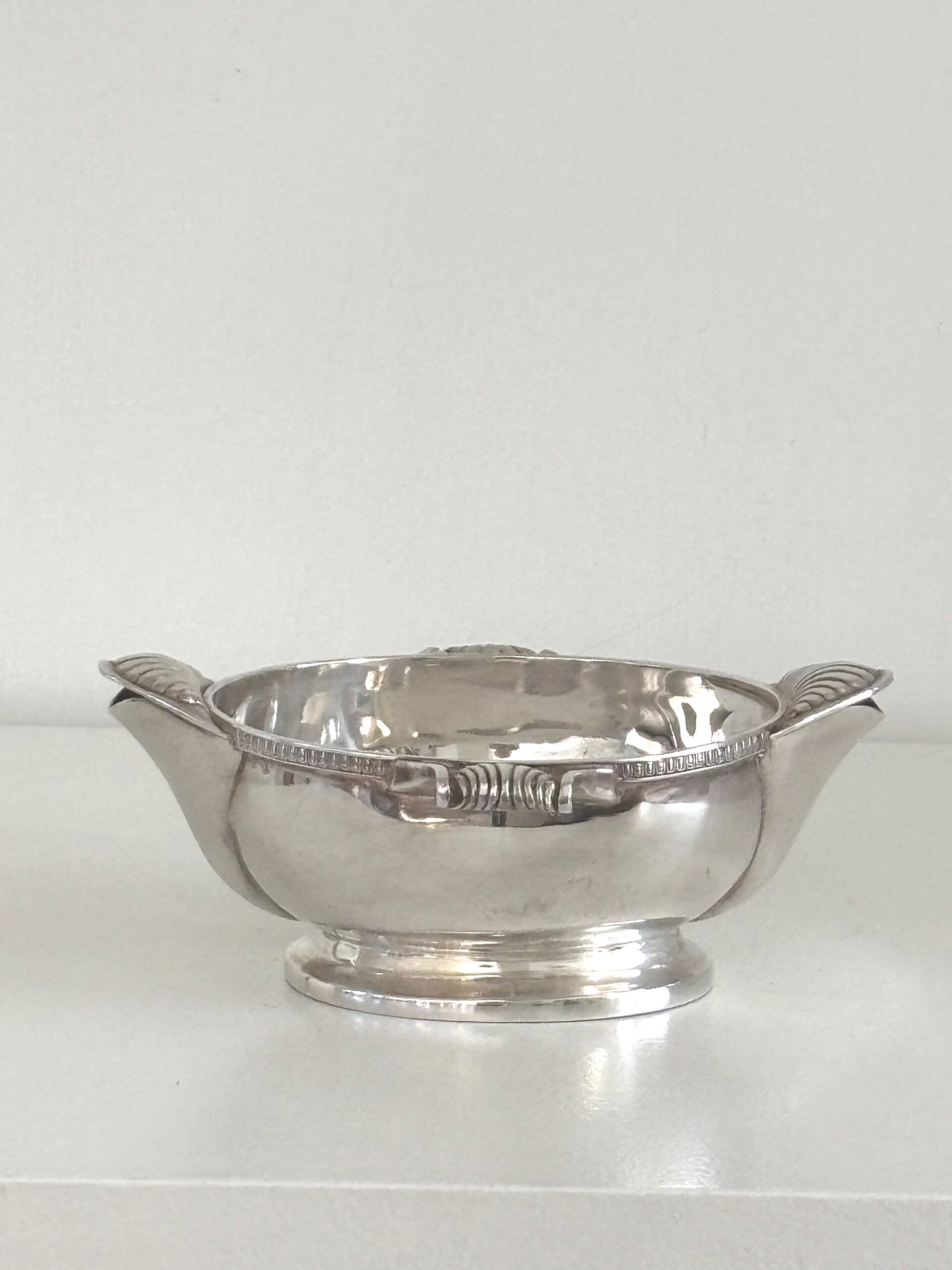 Verzilverd sauskommetje met prachtige details. Voorzien van twee schenktuiten, een kleine en een grote. Afmetingen: 16 x 14 cm.