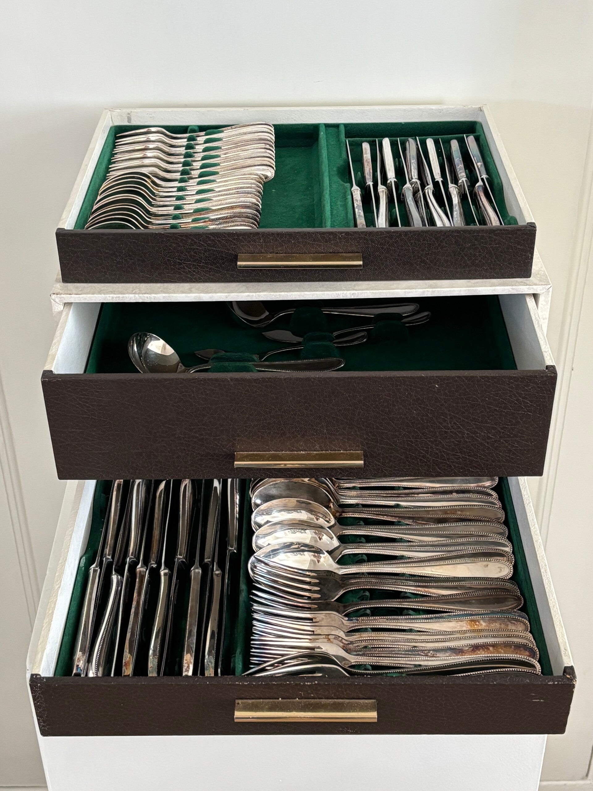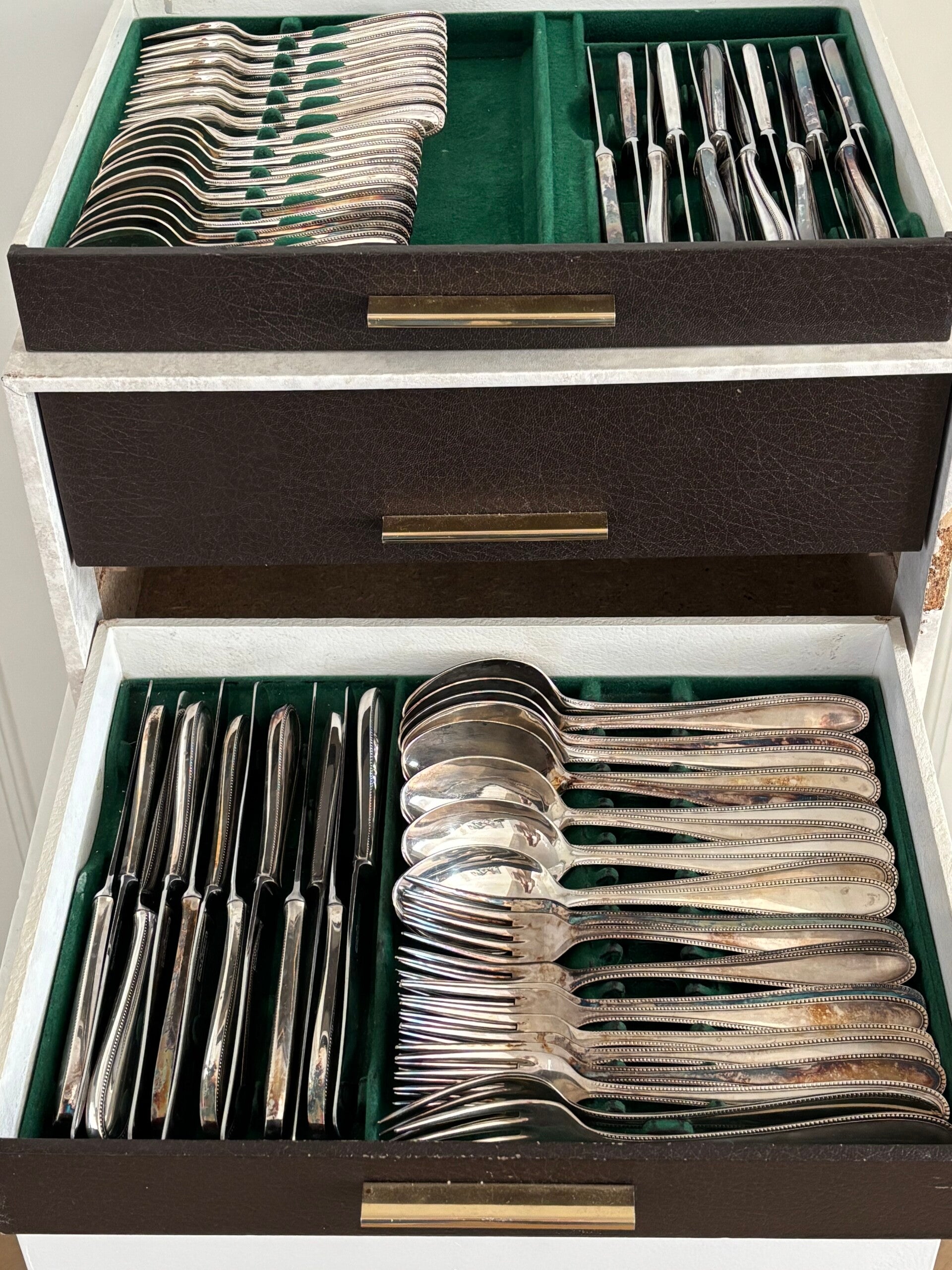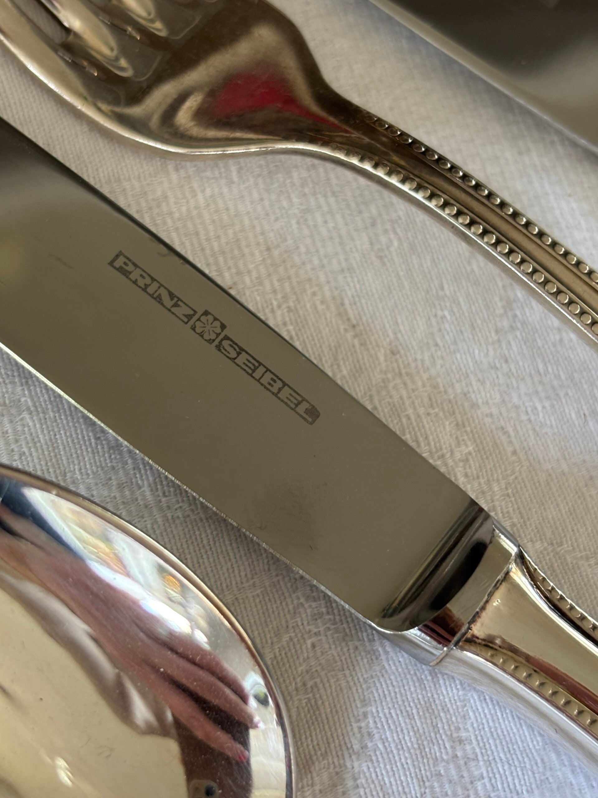 78-Piece silver-plated cutlery set . This 12-person flatware service features a timeless beaded edge and comes in the original case. The butter knives in the top drawer appear unmatched but form a lovely addition to the set. Mark: Prinz Seibel.