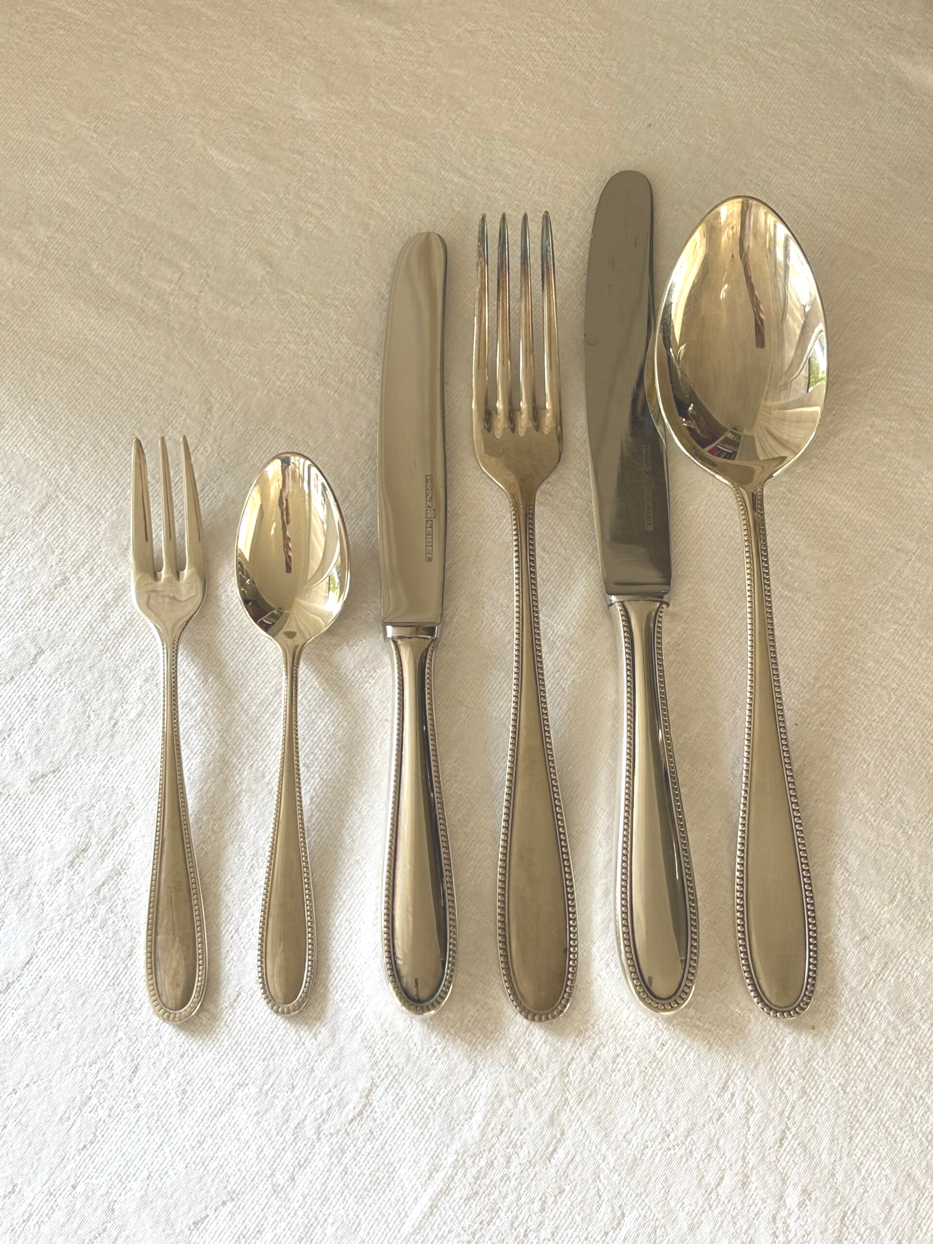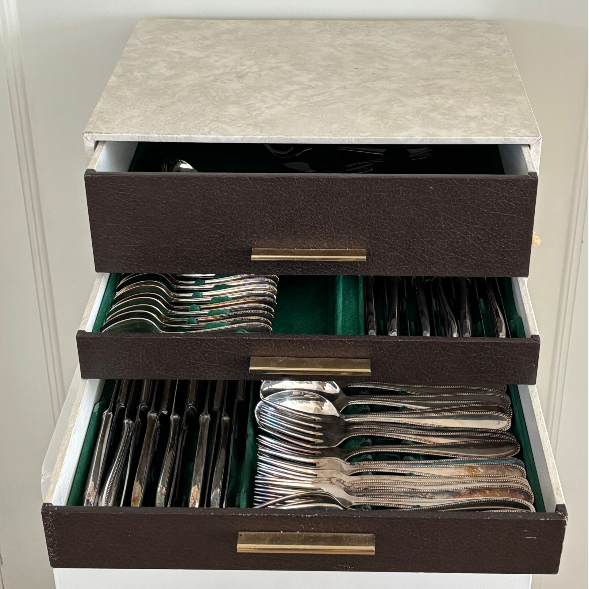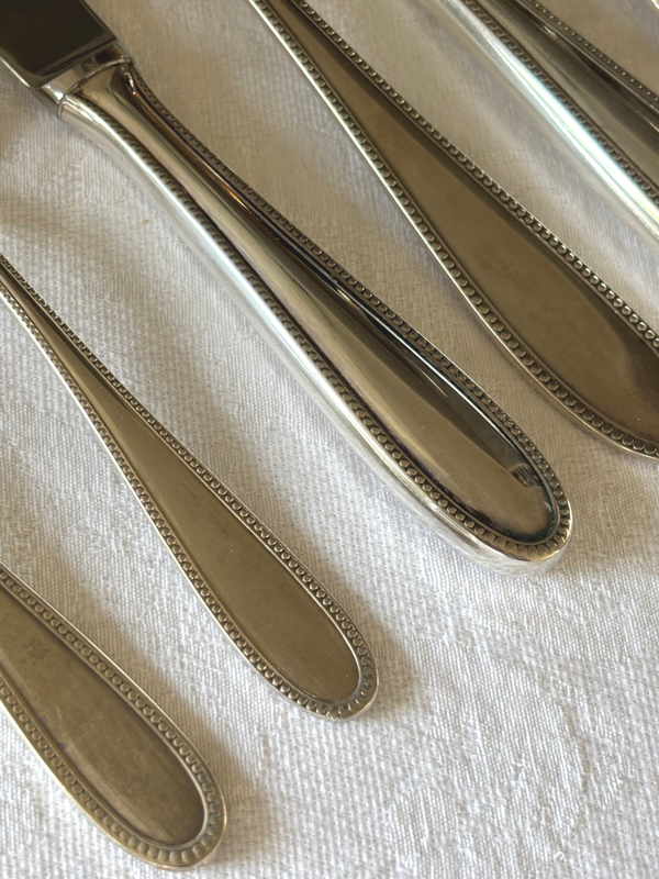 78-Piece silver-plated cutlery set . This 12-person flatware service features a timeless beaded edge and comes in the original case. The butter knives in the top drawer appear unmatched but form a lovely addition to the set. Mark: Prinz Seibel.