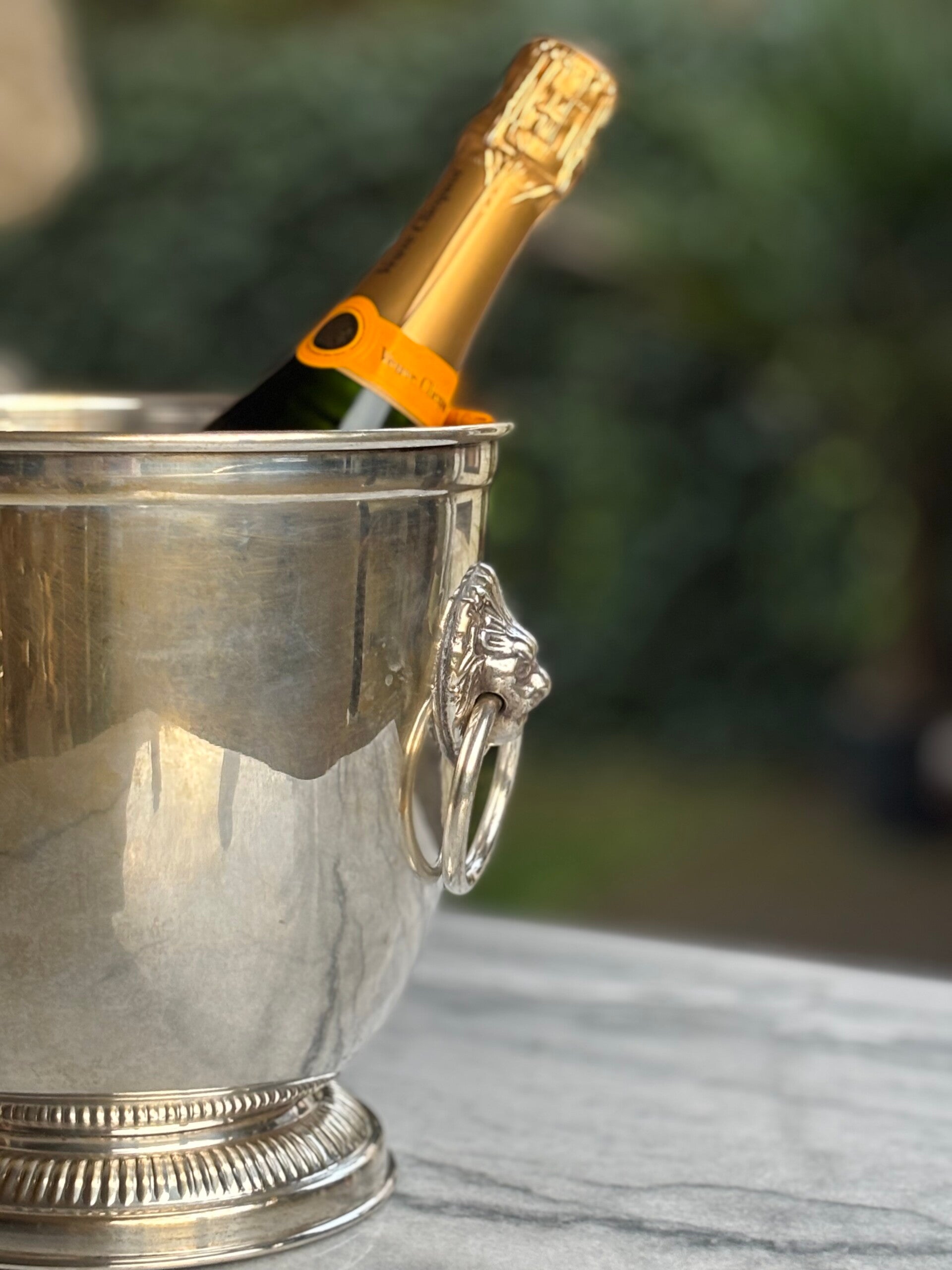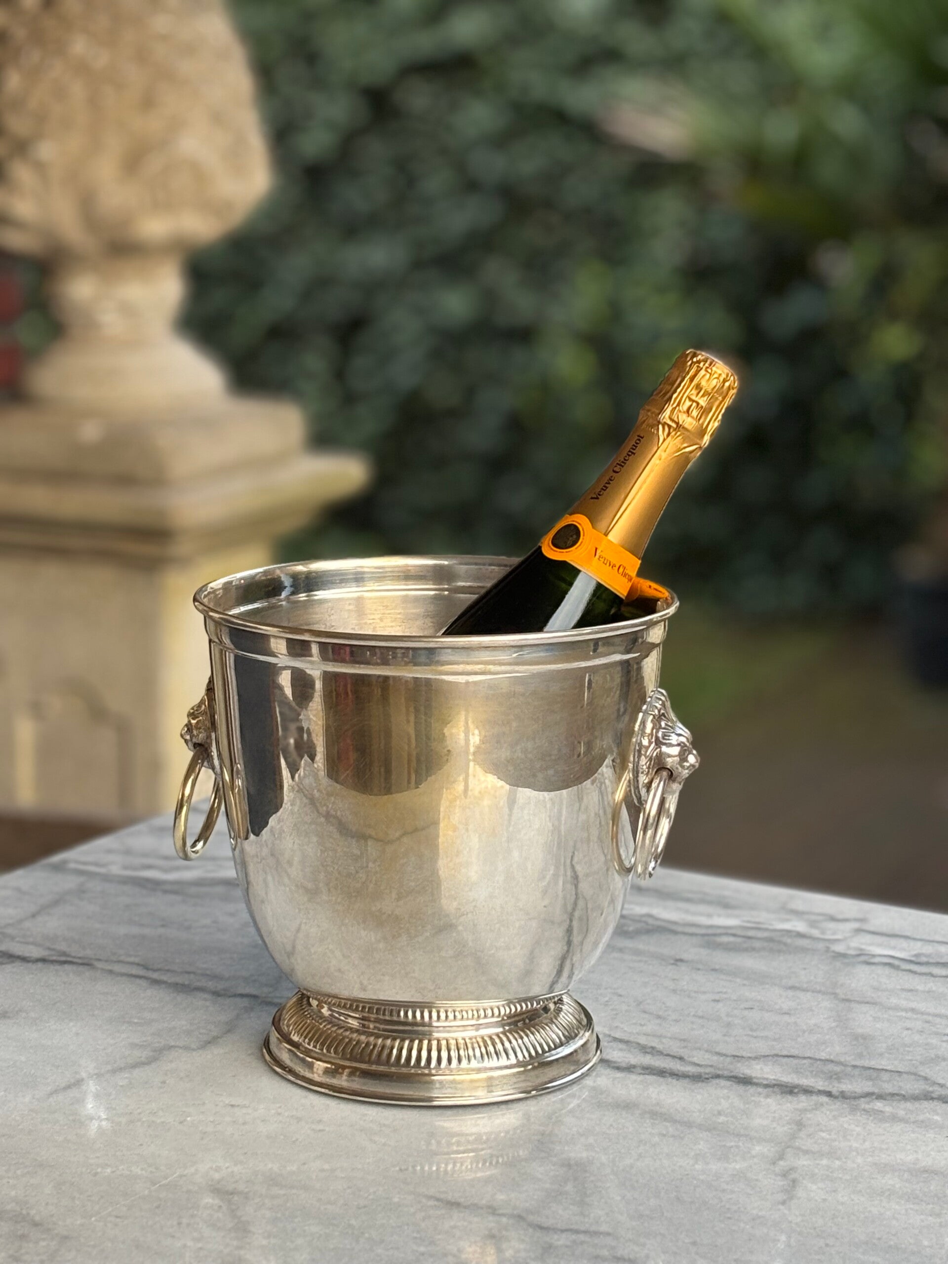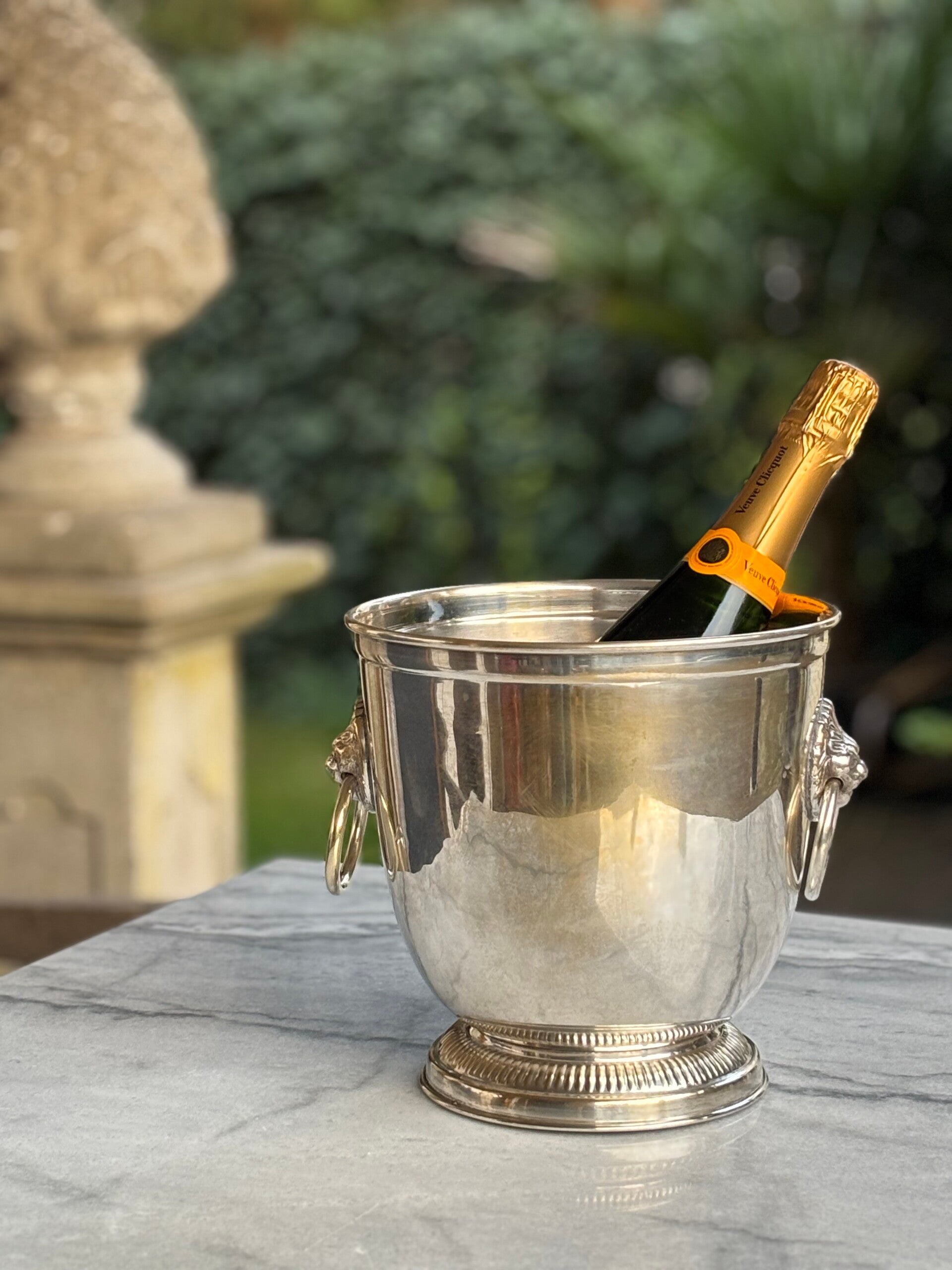 Vintage Champagnekoeler met leeuwenkoppen. Een tijdloos klassiek model en een echte eyecatcher op tafel.