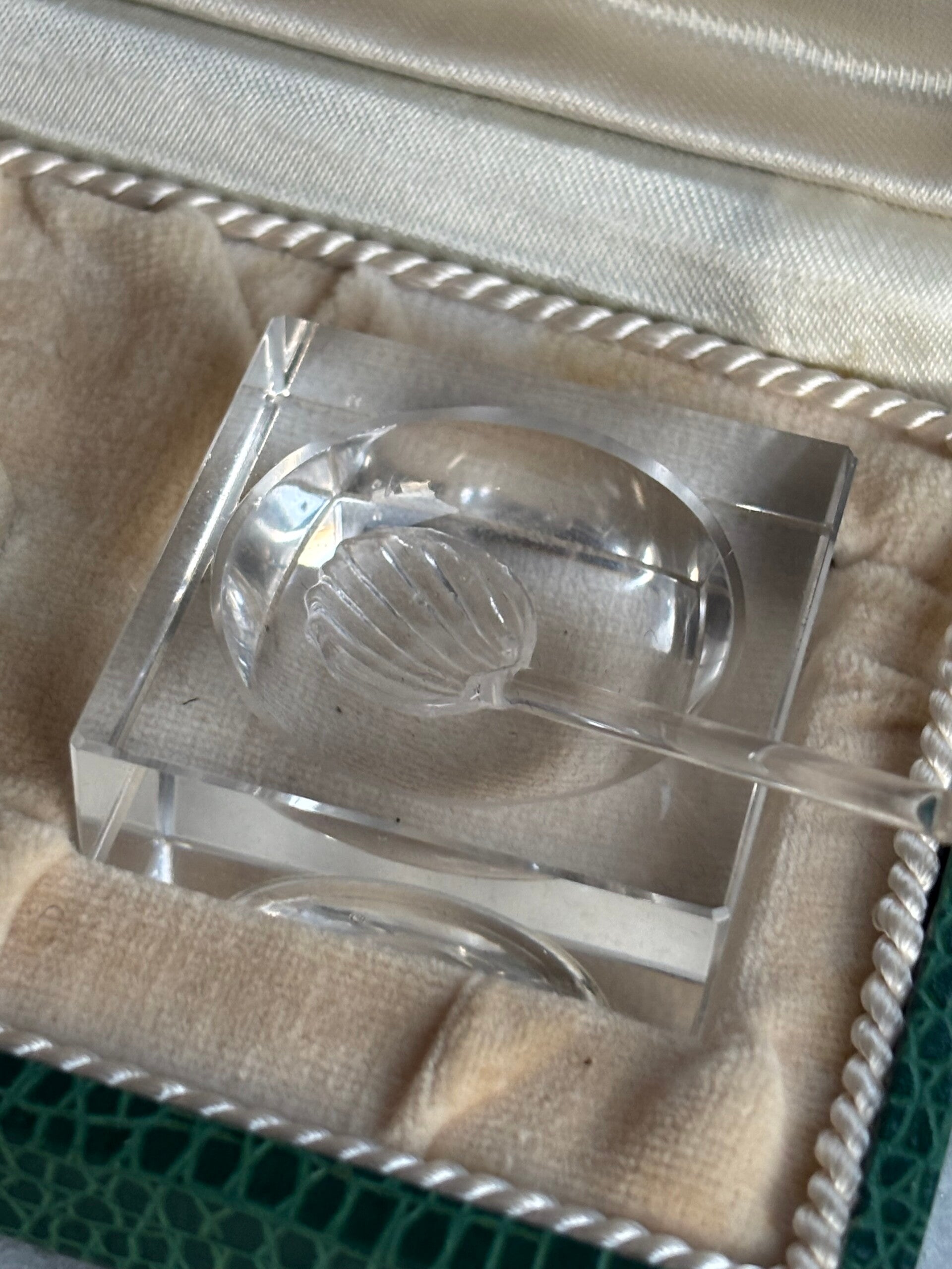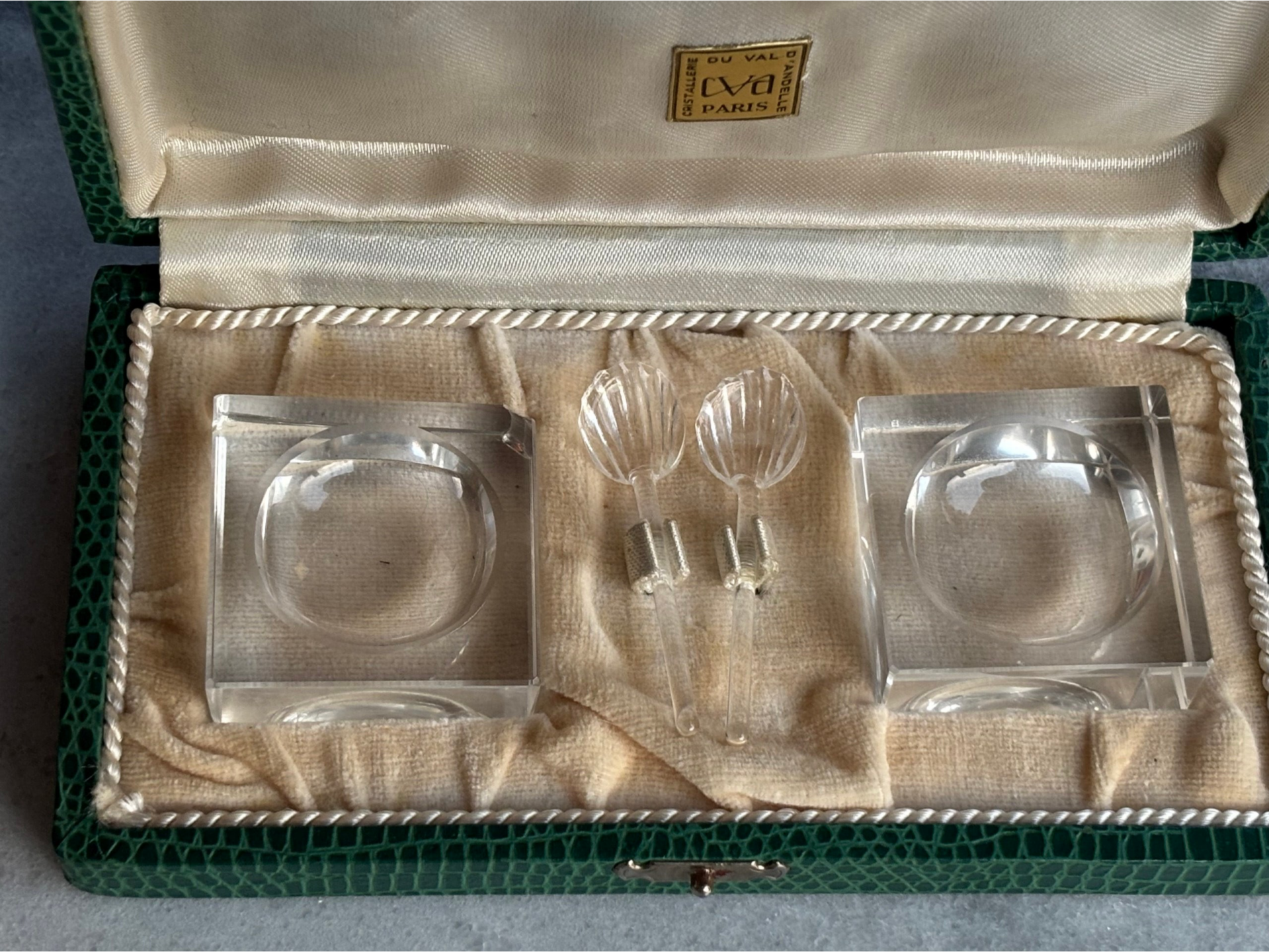 Set of crystal salt dishes with matching spoons by Du Val D’Andelle Paris. Still in the original box. The set is in used vintage condition, see photos.
