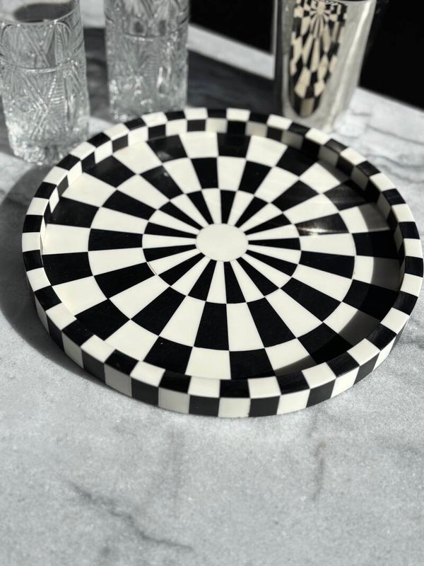 Round serving tray with a timeless inlaid black and white pattern. A stylish decorative piece that adds elegance to any interior or table setting. Diameter: 28.5 cm. Height: 2.8 cm.