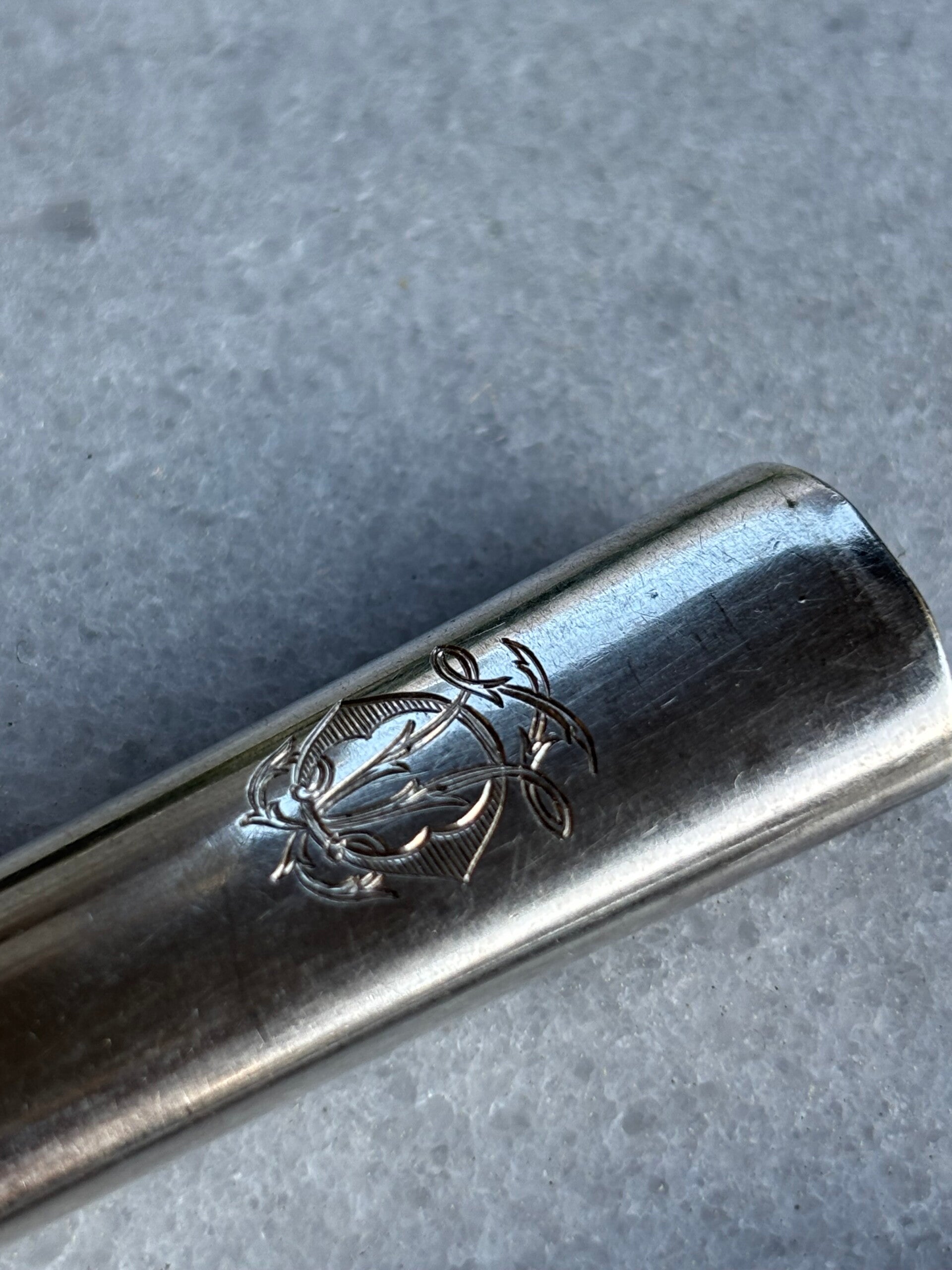 Prachtige en zeldzame set van 12 antieke verzilverde messen met verguld snijvlak/blade. Het verzilverde lemmet is verfijnd gegraveerd met initialen en alle messen dragen merkstempels. Elegant uitgevoerd met een rijke uitstraling en fraai vakmanschap. Lengte per mes: 22 cm. Een bijzondere en decoratieve set voor de gedekte tafel of verzamelaar.