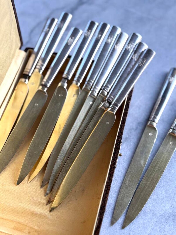Prachtige en zeldzame set van 12 antieke verzilverde en vergulde messen- Beautiful and rare set of 12 antique silver-plated and gilded knives